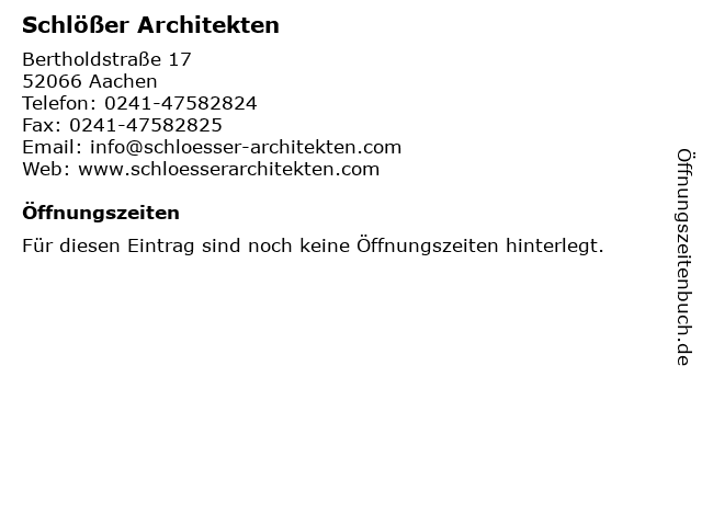 | Öffnungszeiten Schlößer Architekten in Aachen anzeigen | |
