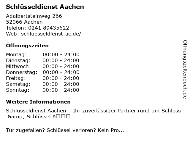 | Öffnungszeiten Schlüsseldienst Aachen in Aachen anzeigen | |