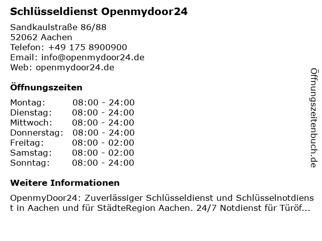 | Telefonnummer Schlüsseldienst Openmydoor24 in Aachen (+49 175 8900900) anrufen | |