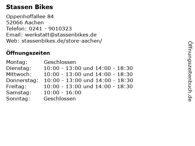 | Öffnungszeiten Stassen Bikes in Aachen anzeigen | |