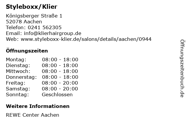 | Öffnungszeiten Styleboxx/Klier in Aachen anzeigen | |