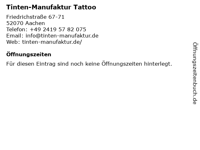 | Öffnungszeiten Tinten-Manufaktur Tattoo in Aachen anzeigen | |