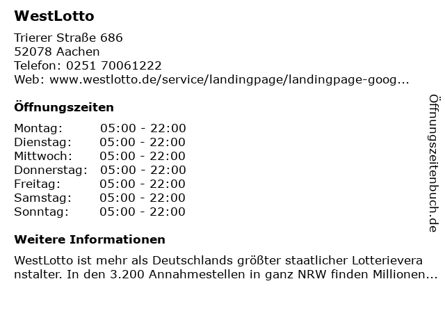 | Öffnungszeiten WestLotto in Aachen anzeigen | |