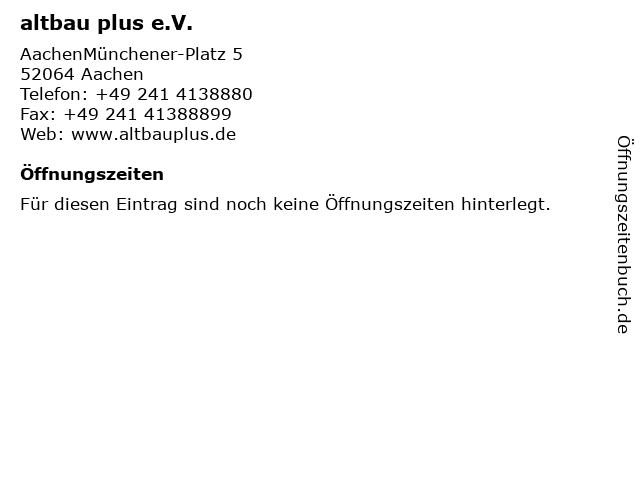 | Öffnungszeiten altbau plus e.V. in Aachen anzeigen | |