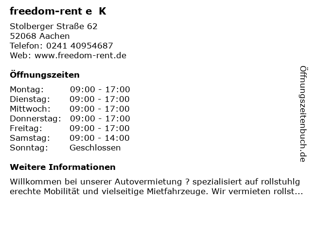 | Öffnungszeiten freedom-rent e K in Aachen anzeigen | |