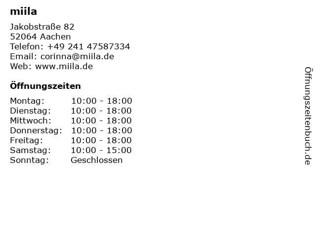 | Öffnungszeiten miila in Aachen anzeigen | |