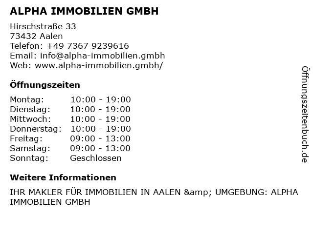 | Öffnungszeiten ALPHA IMMOBILIEN GMBH in Aalen anzeigen | |