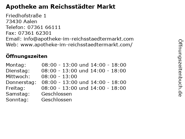 | Öffnungszeiten Apotheke am Reichsstädter Markt in Aalen anzeigen | |