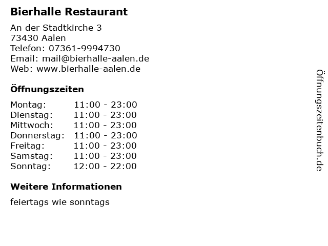 | Öffnungszeiten Bierhalle Restaurant in Aalen anzeigen | |