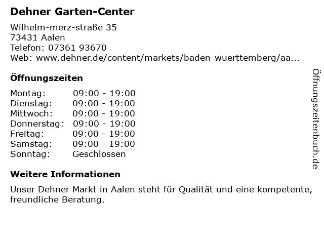 | Öffnungszeiten Dehner Garten-Center in Aalen anzeigen | |