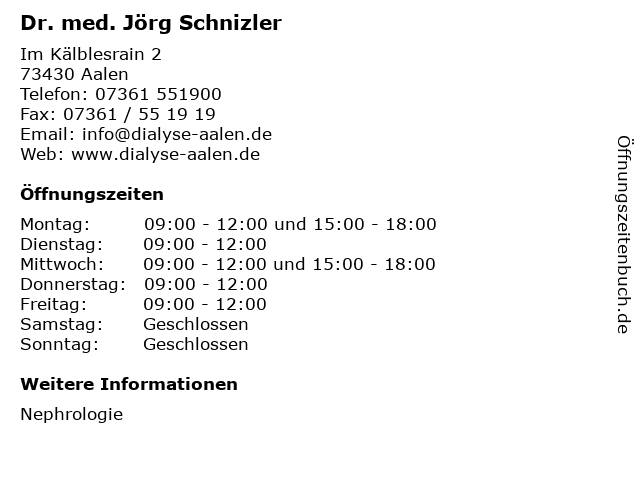 | Öffnungszeiten Dr. med. Jörg Schnizler in Aalen anzeigen | |