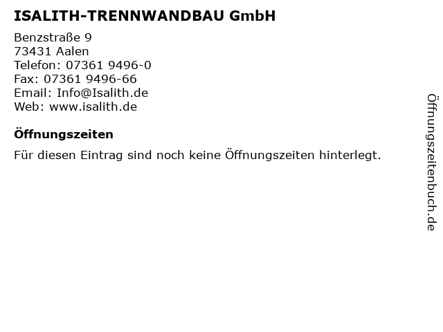 | Öffnungszeiten ISALITH-TRENNWANDBAU GmbH in Aalen anzeigen | |