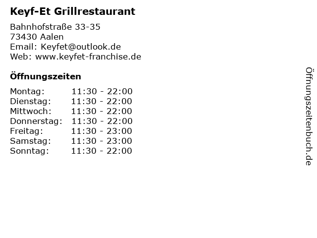 | Öffnungszeiten Keyf-Et Grillrestaurant in Aalen anzeigen | |