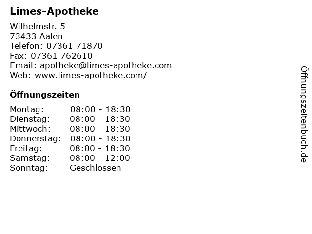 | Öffnungszeiten Limes-Apotheke in Aalen anzeigen | |