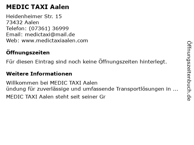 | Öffnungszeiten MEDIC TAXI Aalen in Aalen anzeigen | |