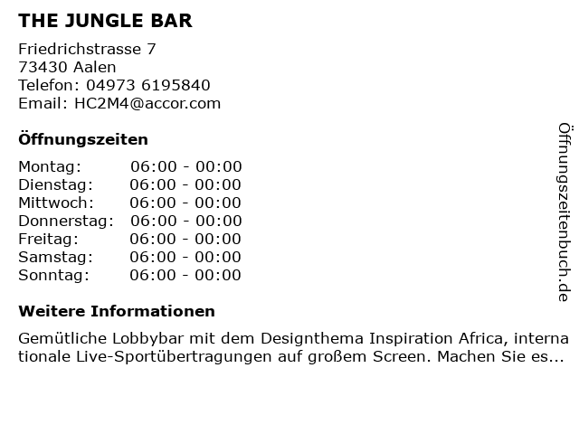 | Öffnungszeiten THE JUNGLE BAR in Aalen anzeigen | |
