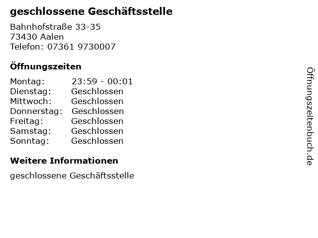 | Öffnungszeiten geschlossene Geschäftsstelle in Aalen anzeigen | |