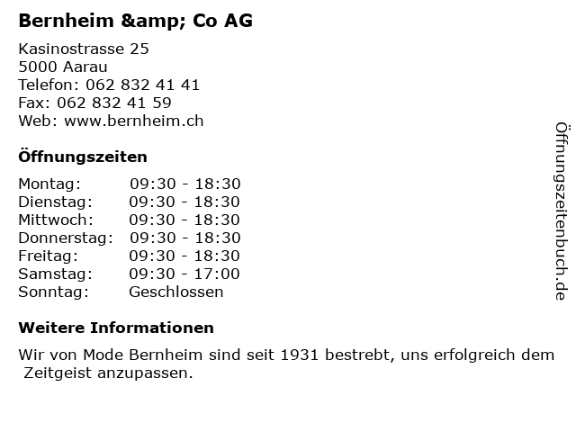 | Öffnungszeiten Bernheim & Co AG in Aarau anzeigen | |