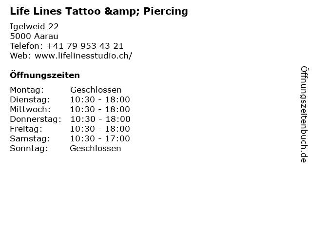 | Öffnungszeiten Life Lines Tattoo & Piercing in Aarau anzeigen | |