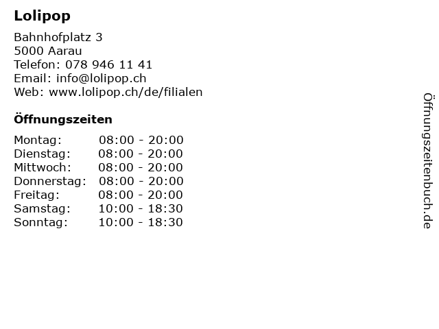 | Öffnungszeiten Lolipop in Aarau anzeigen | |