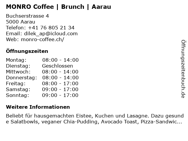 | Öffnungszeiten MONRO Coffee | Brunch | Aarau in Aarau anzeigen | |