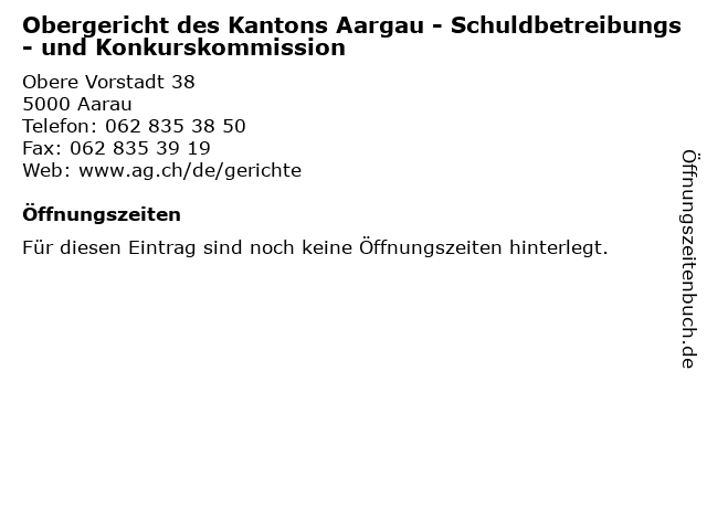Branchen & Suchbegriffe zu Obergericht des Kantons Aargau - Schuldbetreibungs- und Konkurskommission:aargau, amt, behörde, des, kantons, konkurskommission, obergericht, schuldbetreibungs, verwaltung |
