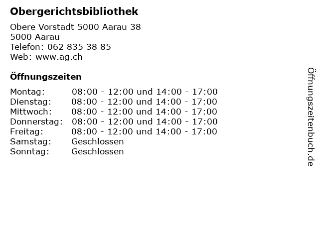 | Öffnungszeiten Obergerichtsbibliothek in Aarau anzeigen | |