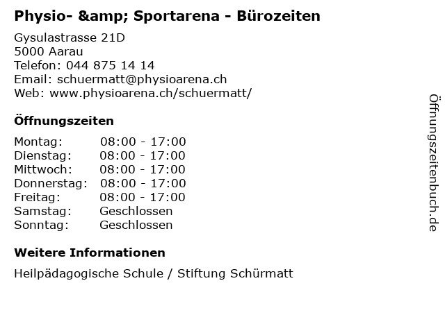 Öffnungszeiten Physio- & Sportarena - Bürozeiten in Aarau anzeigen