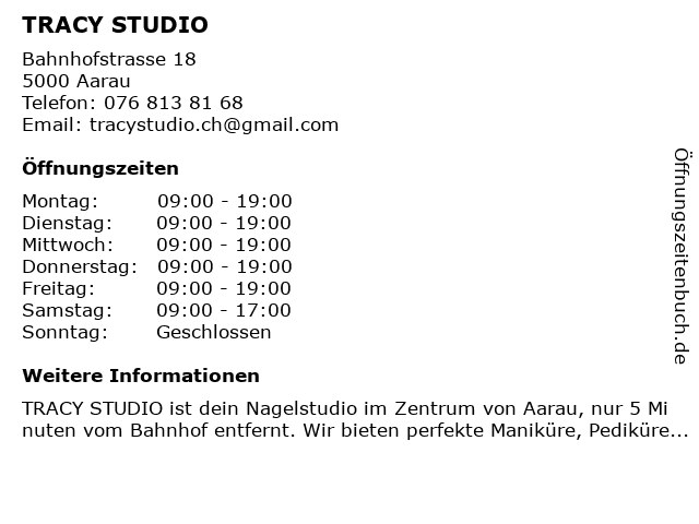 | Öffnungszeiten TRACY STUDIO in Aarau anzeigen | |