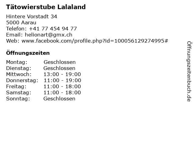 | Öffnungszeiten Tätowierstube Lalaland in Aarau anzeigen | |