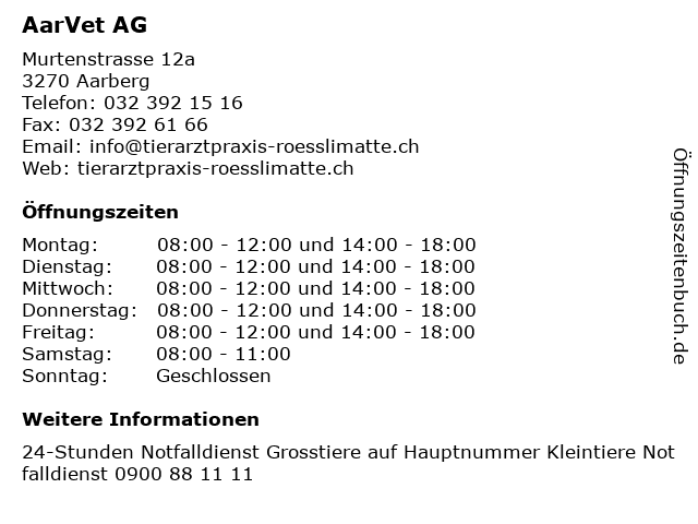 | Öffnungszeiten AarVet AG in Aarberg anzeigen | |