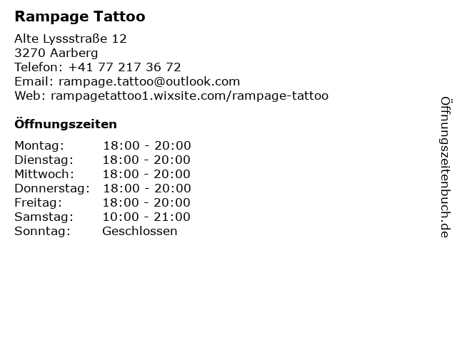 | Öffnungszeiten Rampage Tattoo in Aarberg anzeigen | |