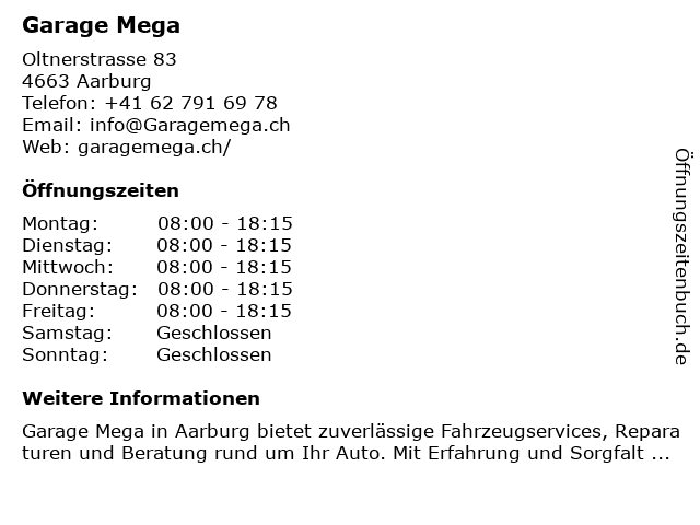 | Öffnungszeiten Garage Mega in Aarburg anzeigen | |