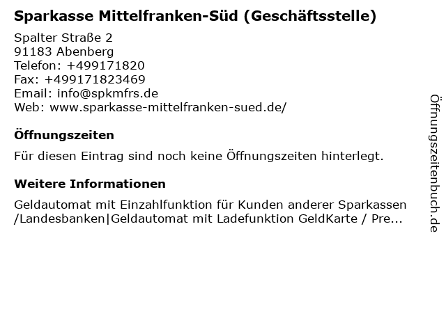 Sparkasse Mittelfranken-Süd (Filiale) in Abenberg: Telefonnummer, Öffnungszeiten und Adresse