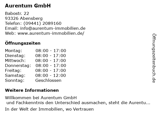 | Öffnungszeiten Aurentum GmbH in Abensberg anzeigen | |
