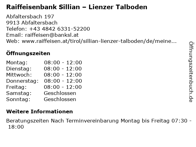 3 Raiffeisenbank Sillian - Bankstelle Abfaltersbach (Entfernung: 1,21 km) Abfaltersbach 197, 9913 Abfaltersbach 4 Raiffeisenbank Sillian eGen - (Bankomat Bankstelle) (Entfernung: 1,21 km) Abfaltersbach 197, 9913 Abfaltersbach 6 |
