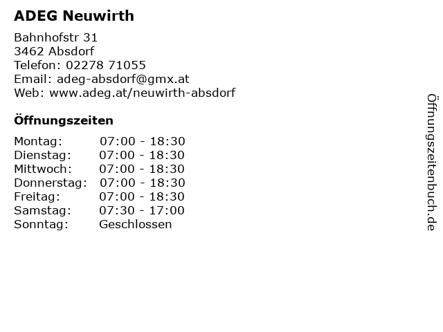 | Öffnungszeiten ADEG Neuwirth in Absdorf anzeigen | |