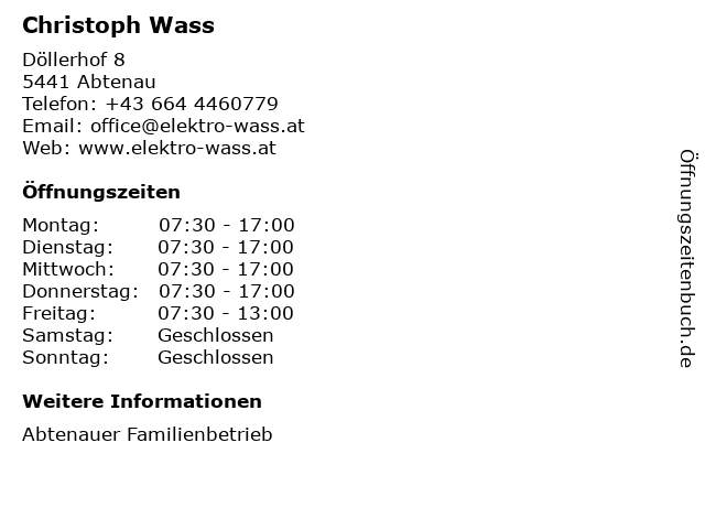 | Öffnungszeiten Christoph Wass in Abtenau anzeigen | |
