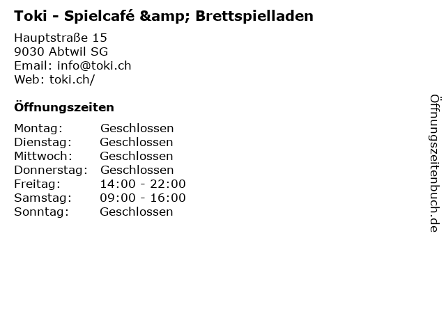 | Öffnungszeiten Toki - Spielcafé & Brettspielladen in Abtwil SG anzeigen | |