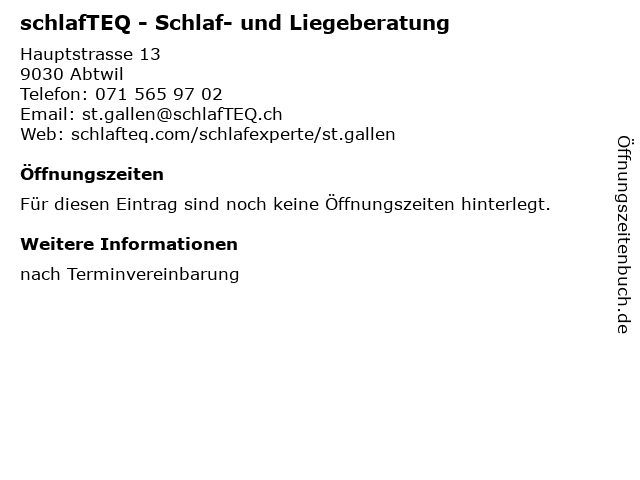 1 schlafTEQ St. Gallen Schlafberatung - Orthopädische Matratzen (Entfernung: 0,01 km) Hauptstrasse 13, 9030 Abtwil SG 6 |