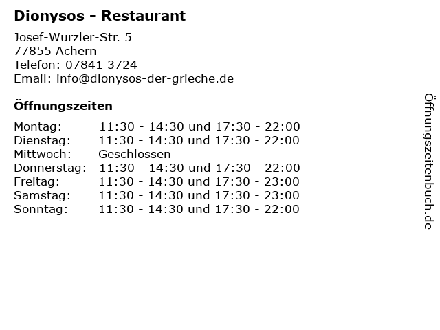 | Öffnungszeiten Dionysos - Restaurant in Achern anzeigen | |