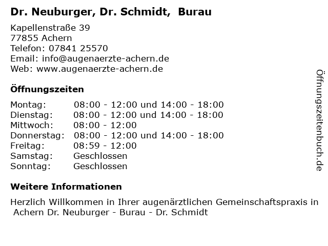 1 Dr. Neuburger - Burau - Dr. Schmidt - augenärztliche Gemeinschaftspraxis (Entfernung: 0,13 km) Kapellenstraße 39, 77855 Achern 2 Jürgen Neuburger Facharzt für HNO-Heilkunde (Entfernung: 40,62 km) Fränznickstr. 16, 76287 Rheinstetten 6 |