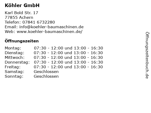 | Öffnungszeiten Köhler GmbH in Achern anzeigen | |