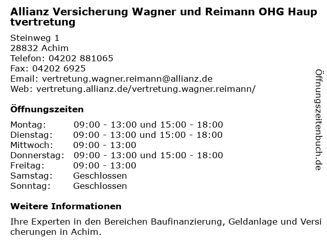 6 Allianz Versicherung Ilbay Bati Hauptvertretung (Entfernung: 8,27 km) Etelser Straße 60, 27299 Langwedel |