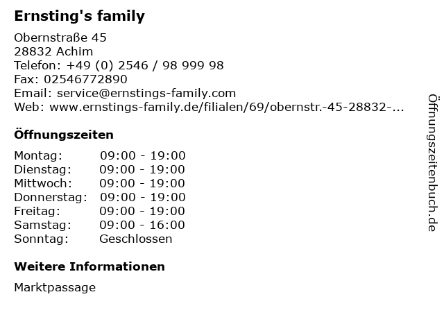 | Öffnungszeiten Ernsting's family in Achim anzeigen | |