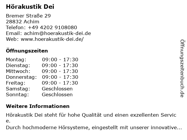 | Öffnungszeiten Hörakustik Dei in Achim anzeigen | |