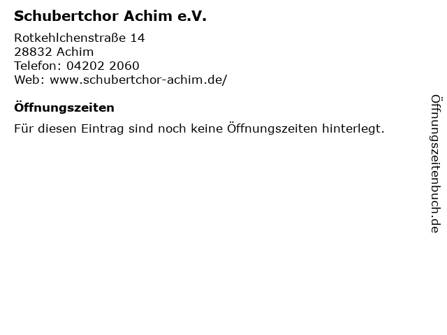 | Öffnungszeiten Schubertchor Achim e.V. in Achim anzeigen | |