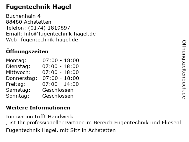 | Öffnungszeiten Fugentechnik Hagel in Achstetten anzeigen | |
