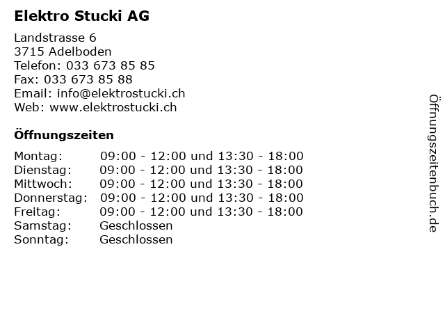 | Öffnungszeiten Elektro Stucki AG in Adelboden anzeigen | |