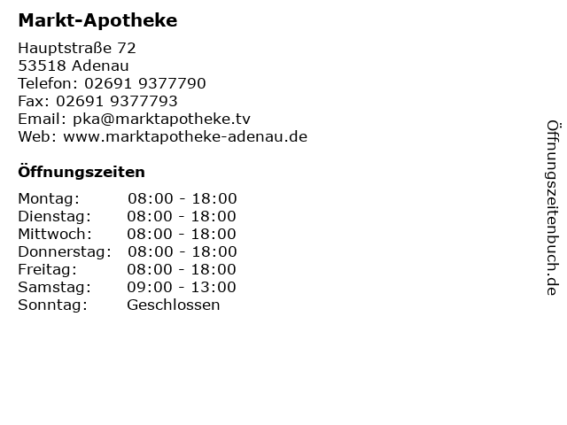 | Öffnungszeiten Markt-Apotheke in Adenau anzeigen | |